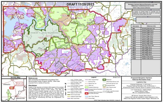 The Benjamin Harrison National Recreation Area and Wilderness Establishment Act would more than double the Hoosier’s Charles C. Deam Wilderness to 28,253 acres and add a 29,382-acre buffer, where use would be restricted primarily to backcountry recreation such as hiking, horseback riding, mountain biking, mushroom gathering, hunting, birdwatching, nature photography, solitude, etc.